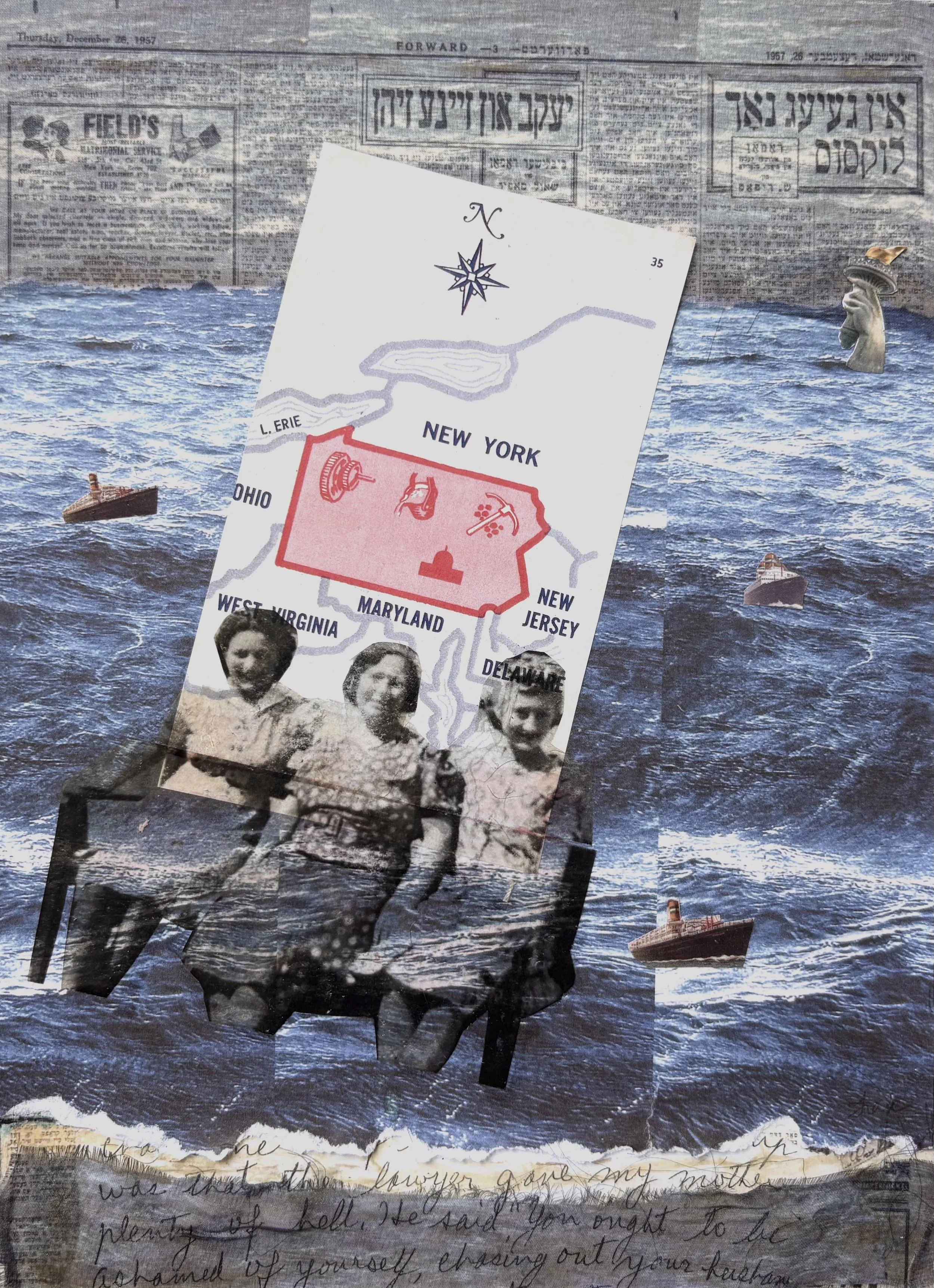 My grandmother died when I was quite young though I remember sitting on her lap, talking with her and looking into her very blue eyes. Funny, because I later found out she hadn’t been able to speak English. Because their household would have been a combination of Yiddish and English I chose to use as a background a page of The Forward, a newspaper which reported in both. The advertising promoting the American way of life was particularly interesting to me. Most notable was the irony of the matrimony service ad contrasted with the handwritten text at the bottom relating my grandmother’s unsuccessful attempt to legally force my grandfather to support his family. Which was met with a scolding by the judge.