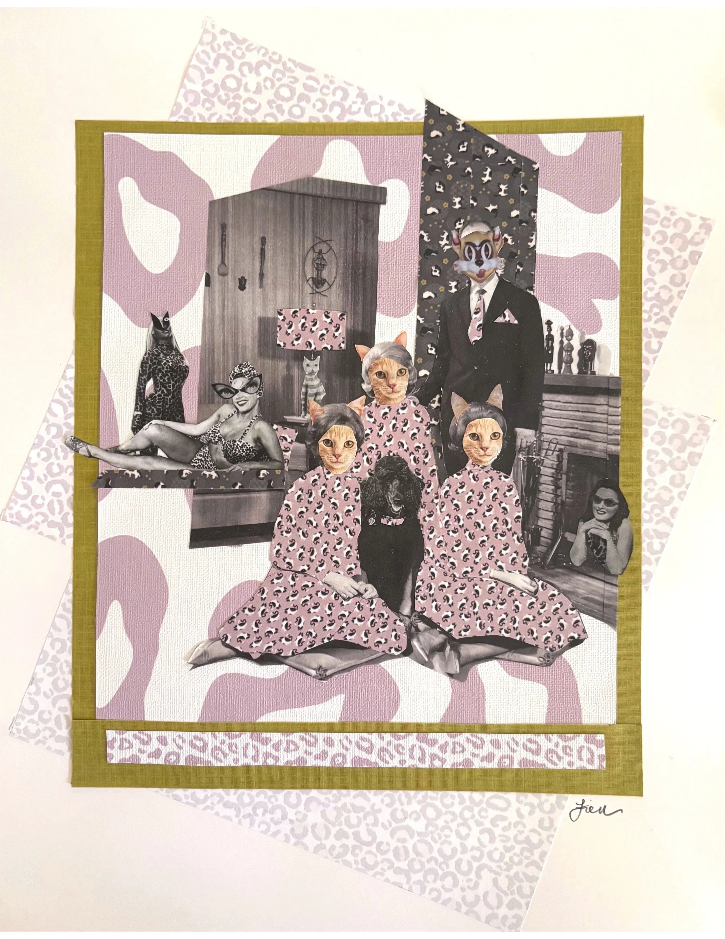 Materials: Vintage family and pop culture photos collaged on wall paper.