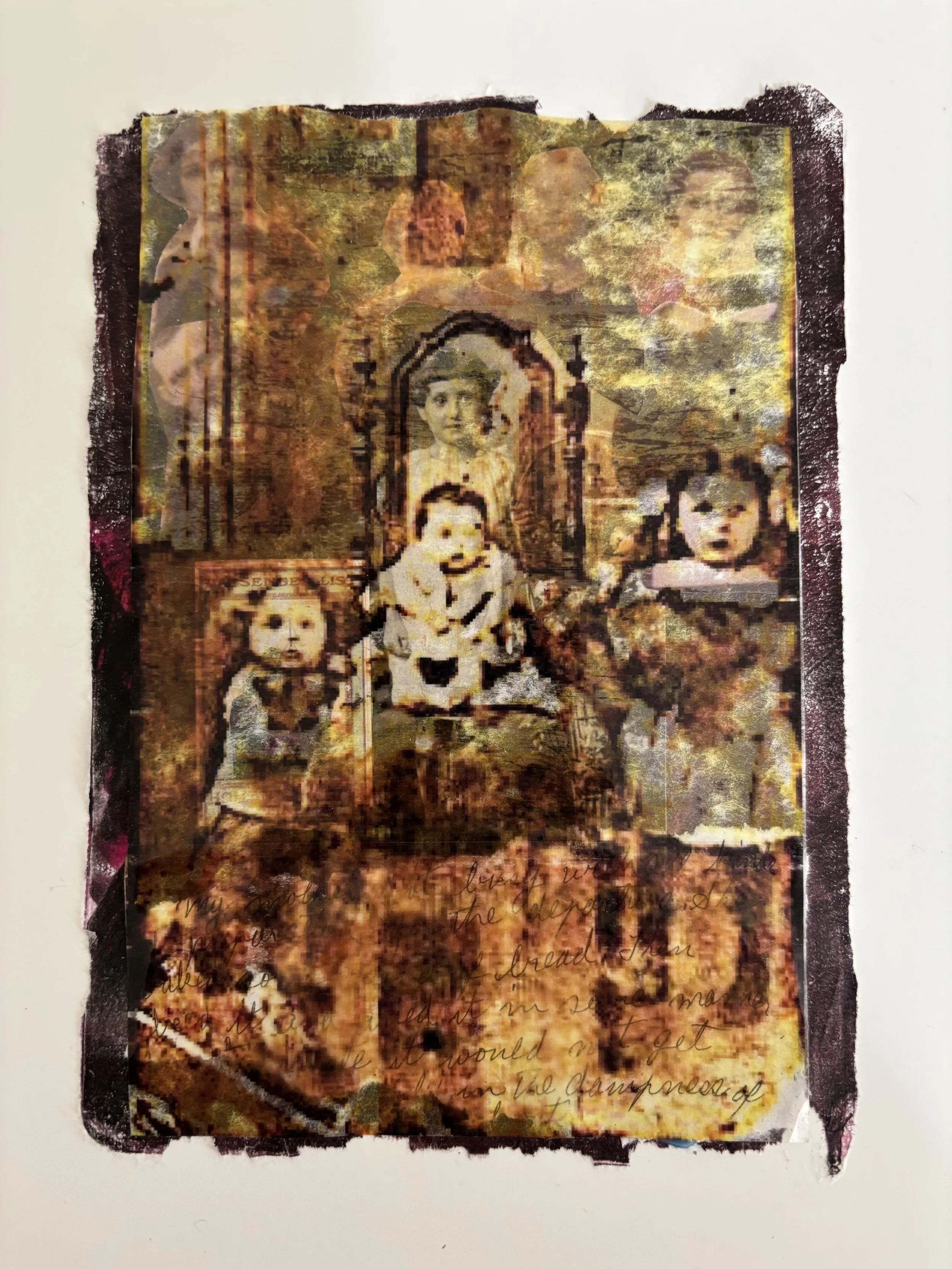 Materials: Vintage photo transparency, image transfers, oil pastels, painted papers