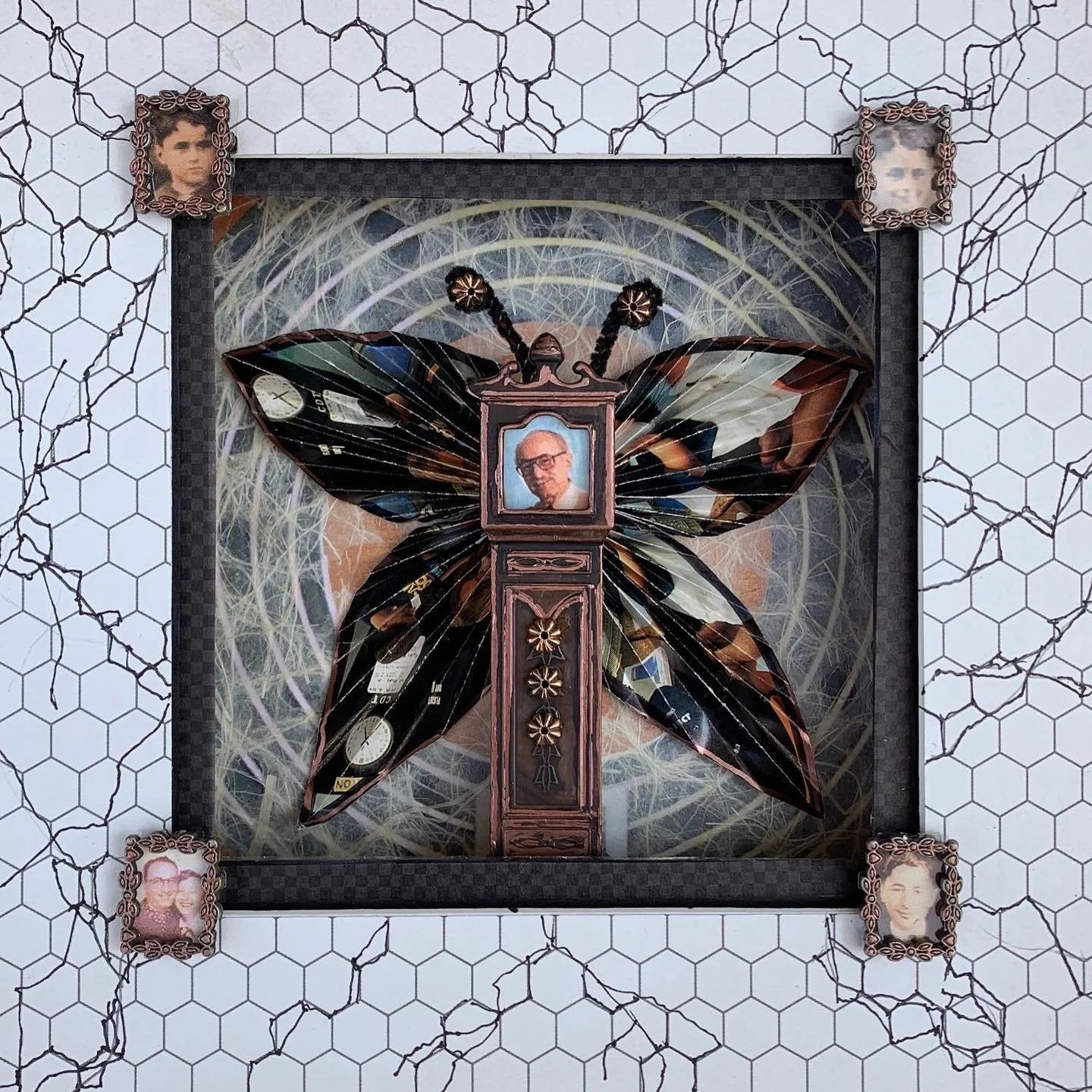 Materials: Vintage photos and National Geographic images, plastic miniature grandfather clock, metal, agoura lace paper, 45rpm record cover, washi tape, recycled box frame